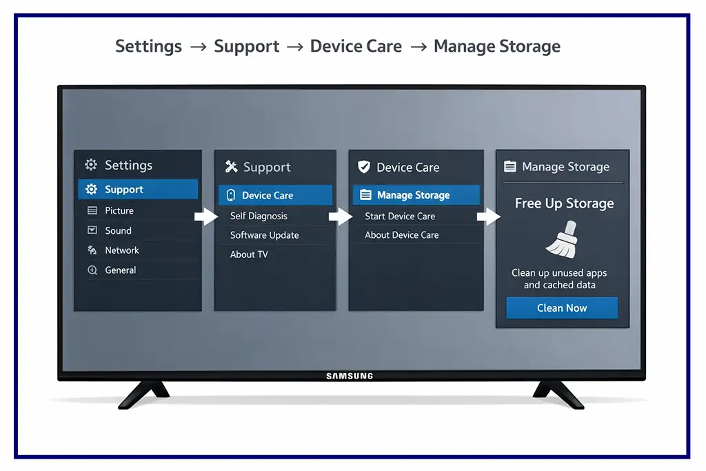 Per controllare quanta memoria è utilizzata, apri Apps sulla TV e vai su Settings (l’icona a forma di ingranaggio nell’angolo in alto a destra). In questa sezione viene normalmente mostrata quanta memoria occupano le app. Su alcuni modelli, le informazioni sulla memoria sono disponibili anche in Settings → Support → Device Care → Manage Storage, dove la TV mostra quanta memoria è utilizzata e quanta è disponibile.