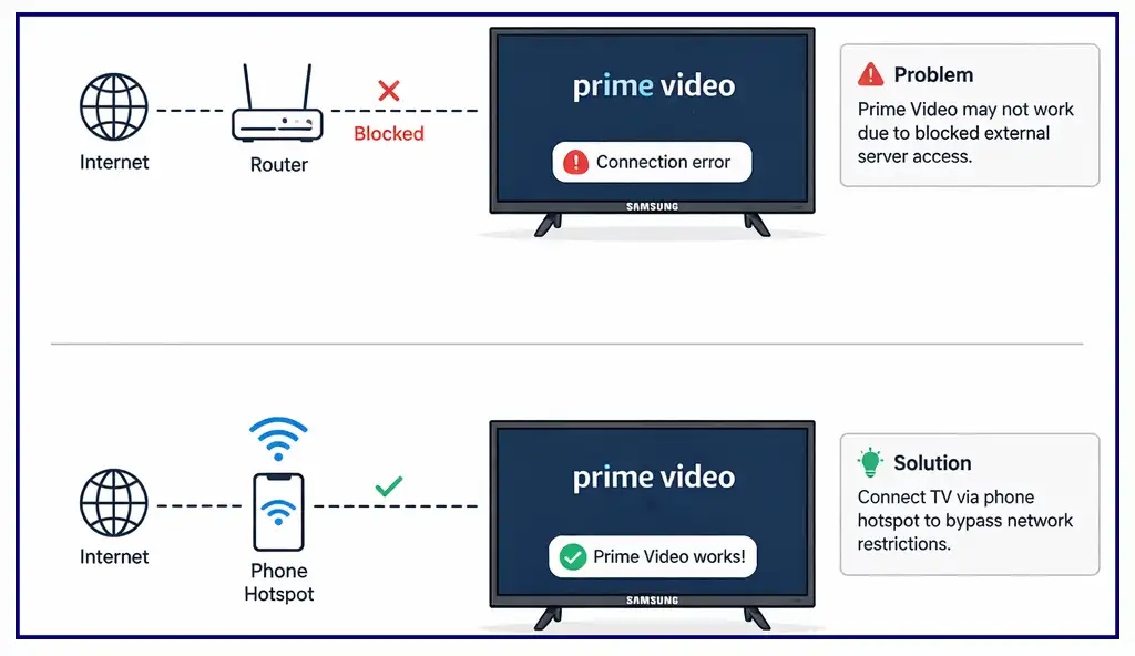 Per verificare se il problema è la rete, prova a collegare la TV a Internet usando un’altra connessione. Ad esempio, attiva un hotspot sul tuo telefono e collega la TV a quello invece di usare il router di casa. Poi riapri Prime Video.