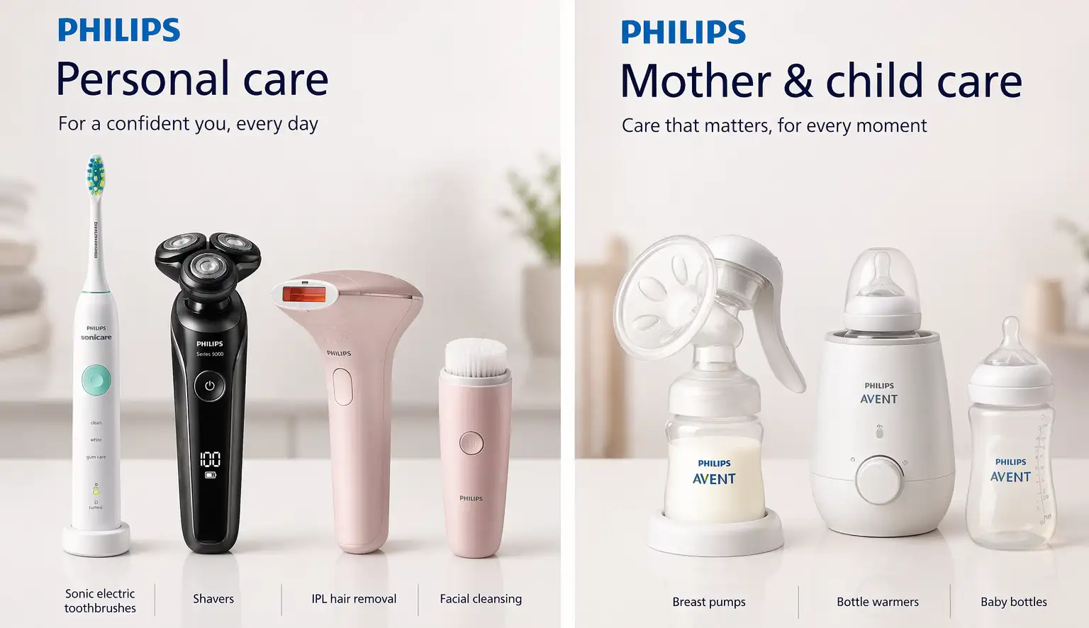 Oggi Royal Philips mantiene il controllo sullo sviluppo dei prodotti per la cura personale e dei dispositivi per la cura di madri e bambini. Tuttavia, anche questi prodotti non vengono fabbricati direttamente da Philips, ma sono progettati dall’azienda e prodotti da partner OEM.