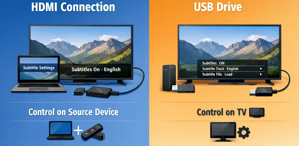 Quando è collegata tramite HDMI, la TV riceve un segnale video già pronto con i sottotitoli incorporati. In altre parole, la TV funge essenzialmente da monitor. Questo significa che tutte le impostazioni — attivazione o disattivazione dei sottotitoli, selezione della lingua o del formato di visualizzazione — vengono effettuate sul dispositivo sorgente, come un laptop o un dispositivo di streaming come Amazon Fire TV Stick.